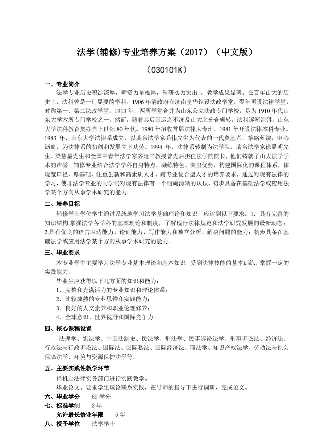 法学(辅修)专业培养方案(2017)
